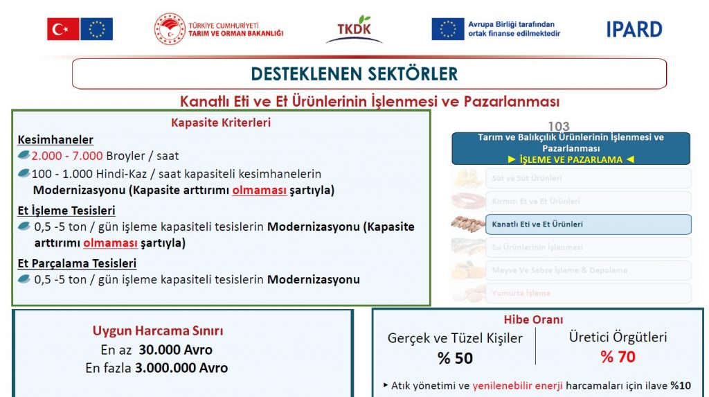 Bu destek, işletmelerin AB standartlarına (hijyen, hayvan refahı, gıda güvenliği ve çevre koruma) uyum sağlamasını ve rekabet gücünün artırılmasını hedefler.